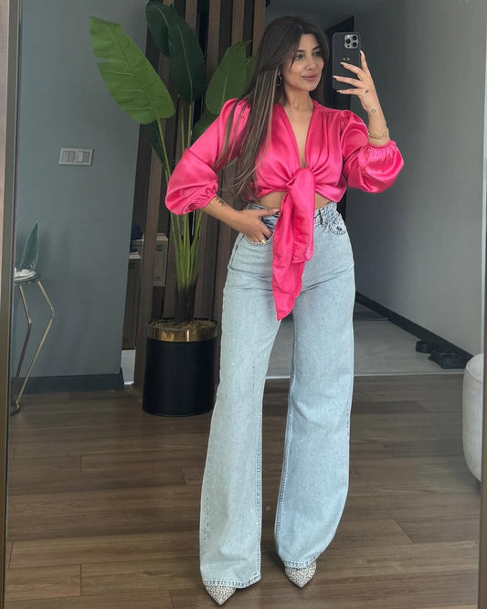 Hot Pink Satin Tie Knot Crop Top