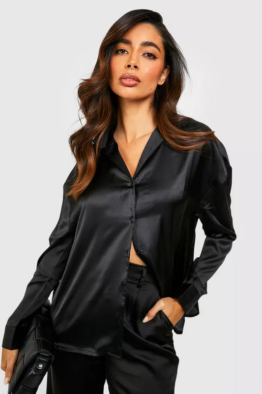 Black Satin Shirt With Black High Waist Pants