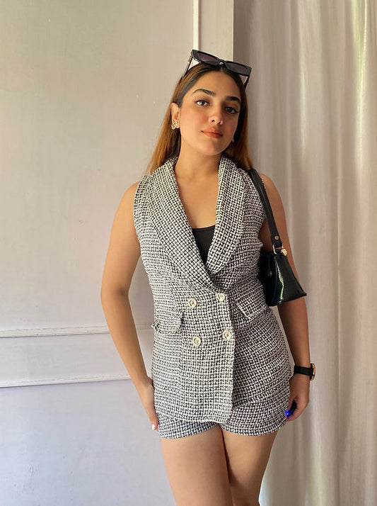 Tweed Sleeveless Double Breasted Blazer With Shorts