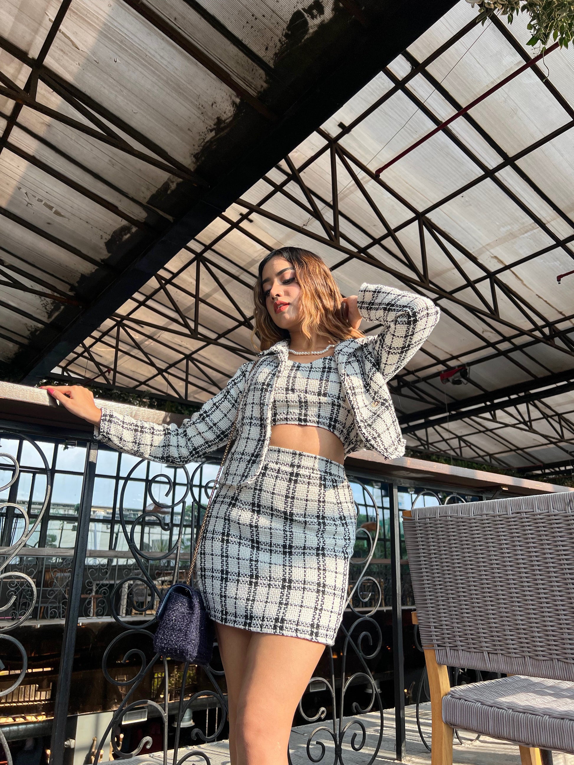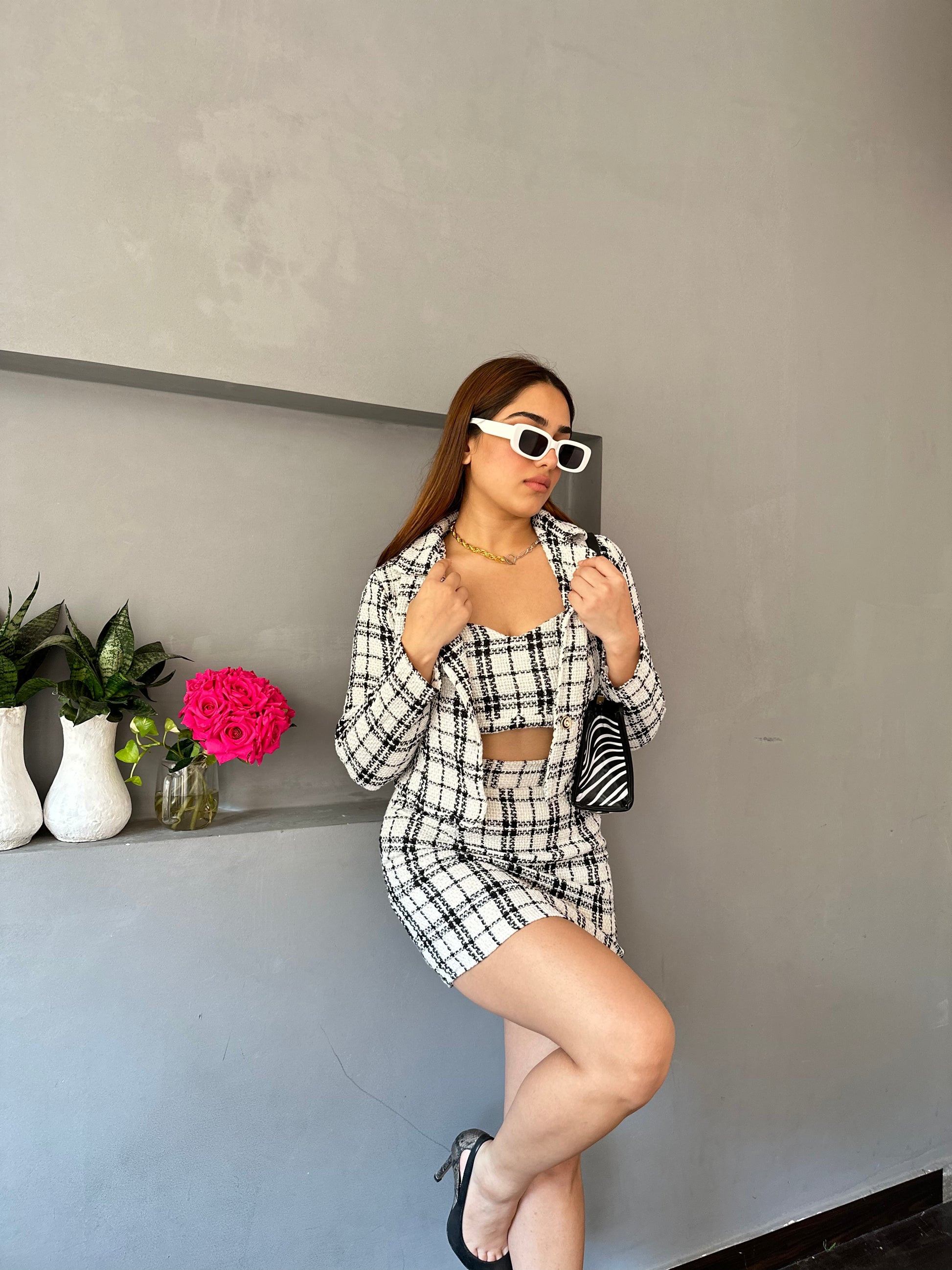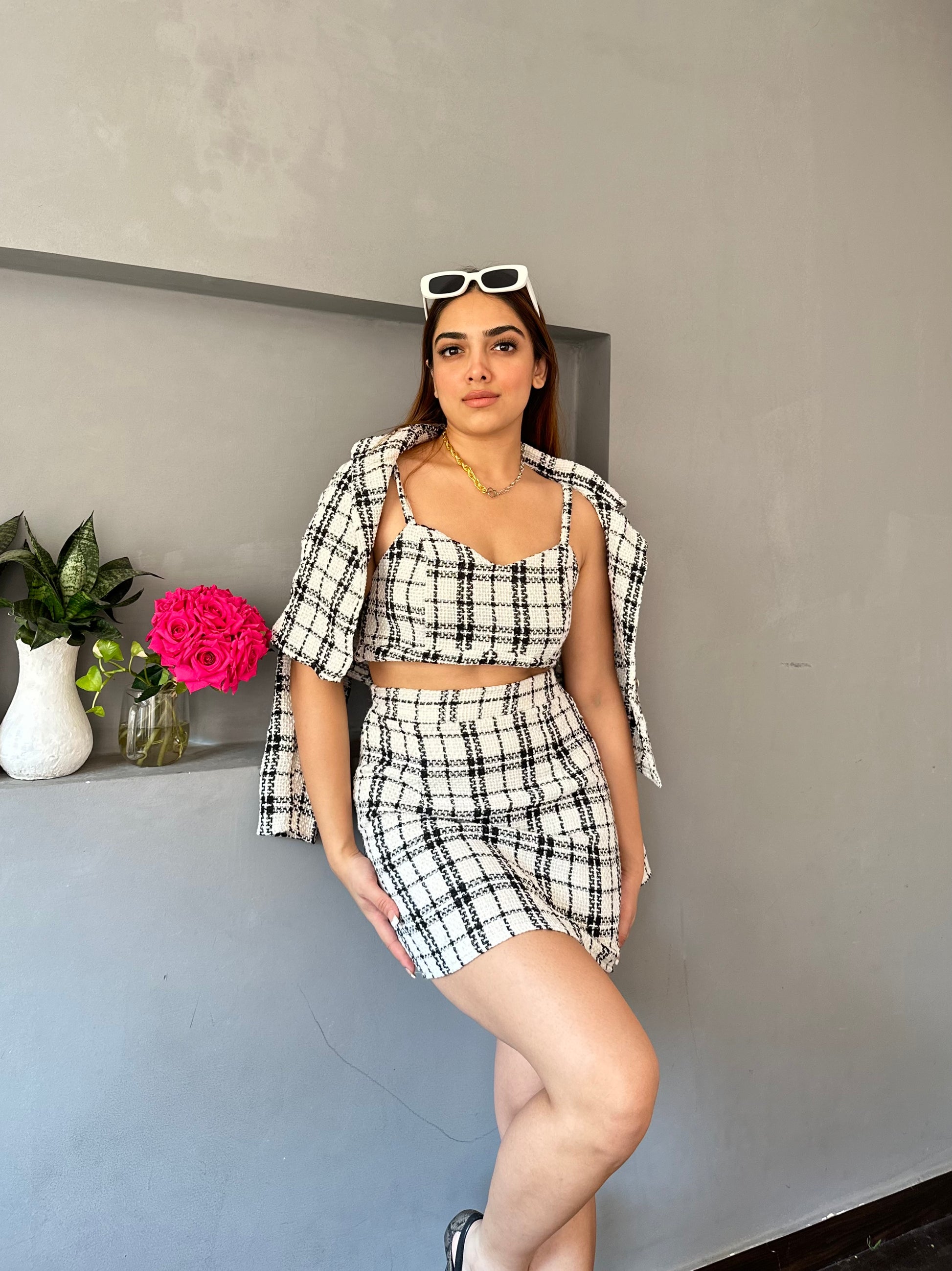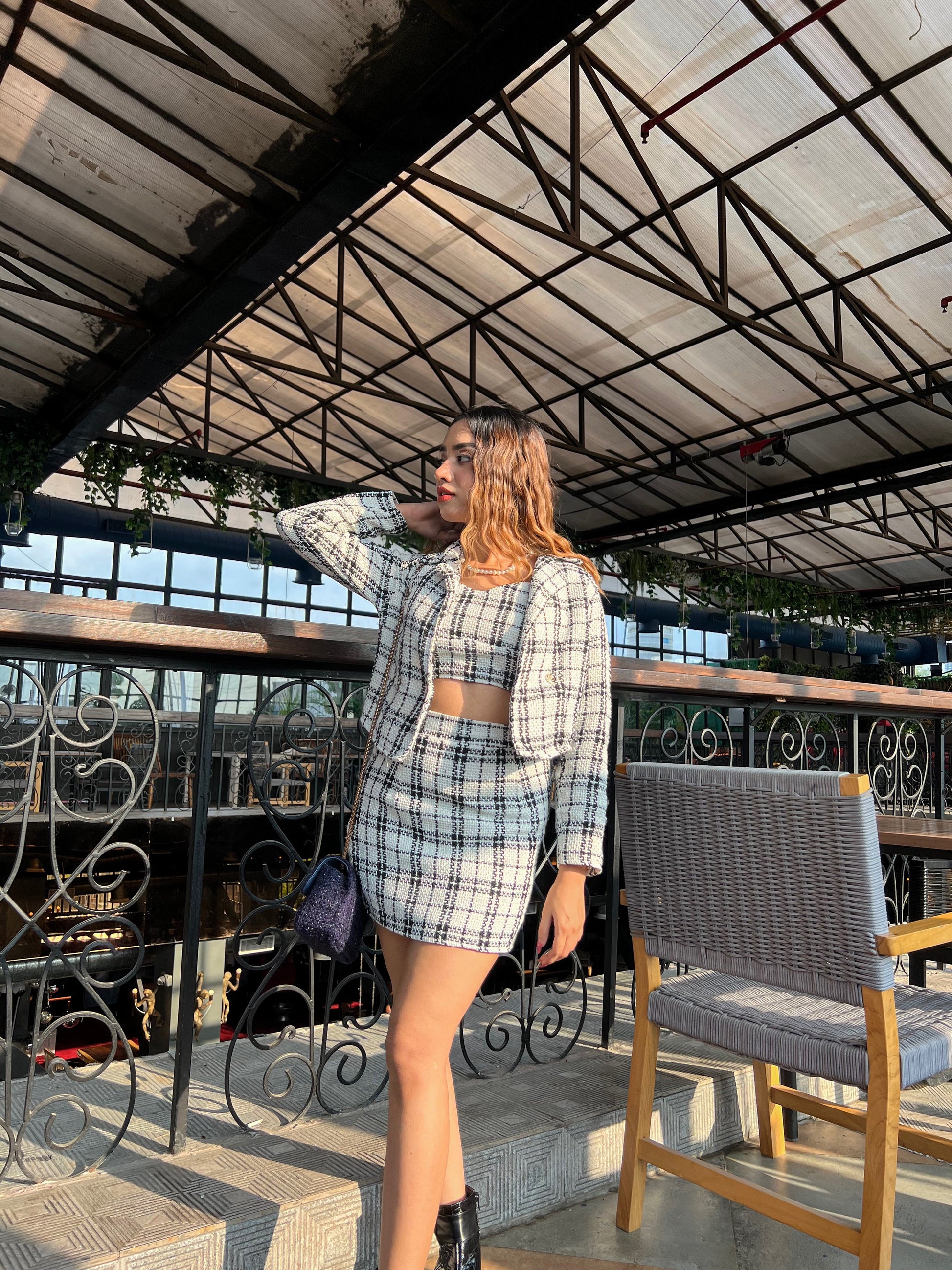 - Details: Set of 3: Cami Tweed Crop Bustier, Button Front Blazer, Fitted Short Skirt