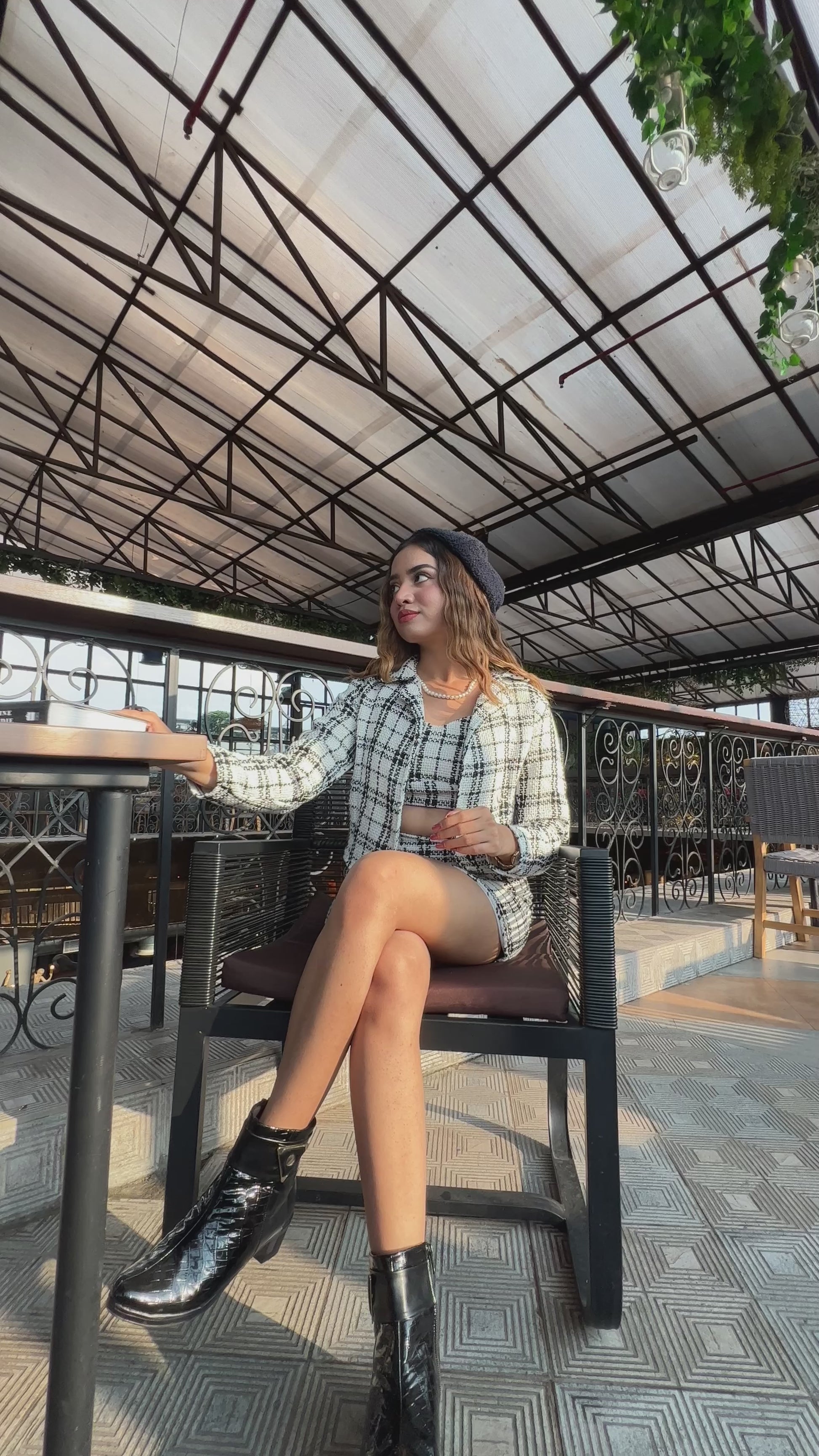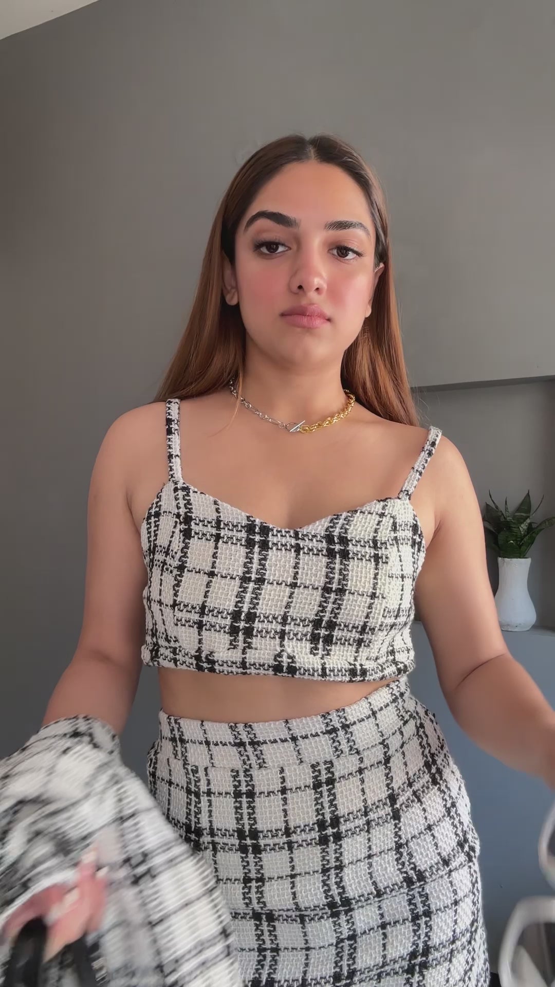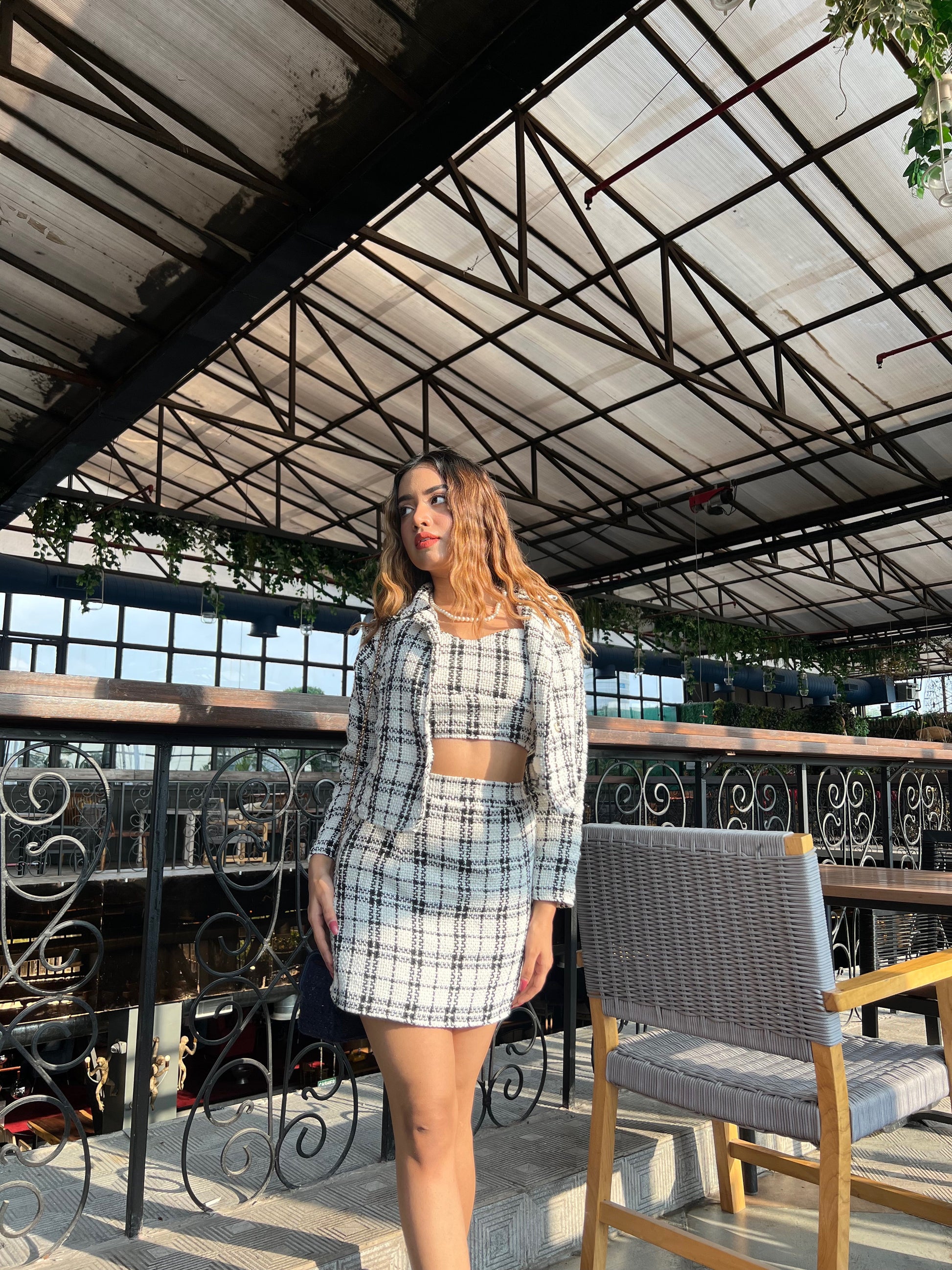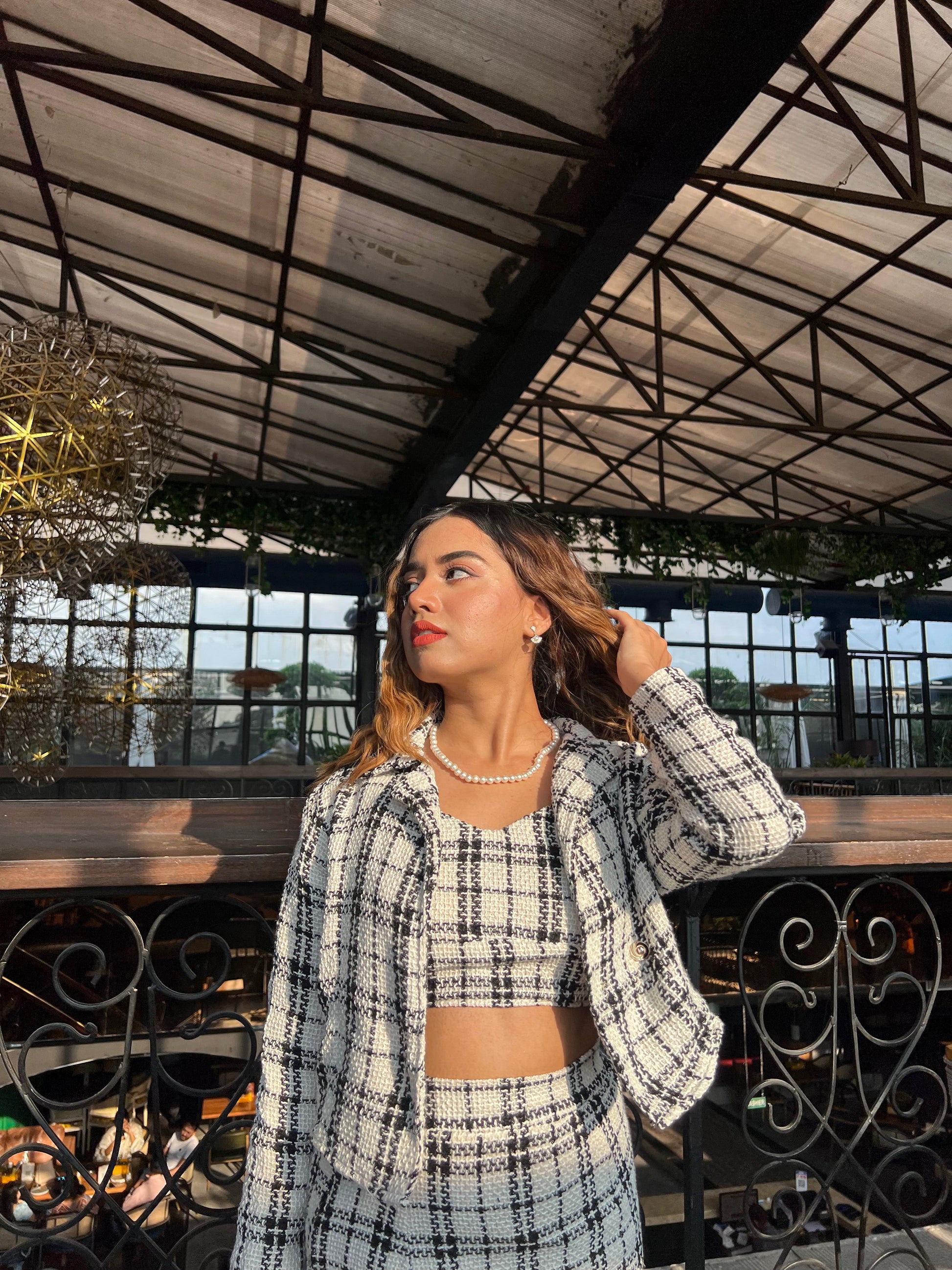 - Details: Set of 3: Cami Tweed Crop Bustier, Button Front Blazer, Fitted Short Skirt