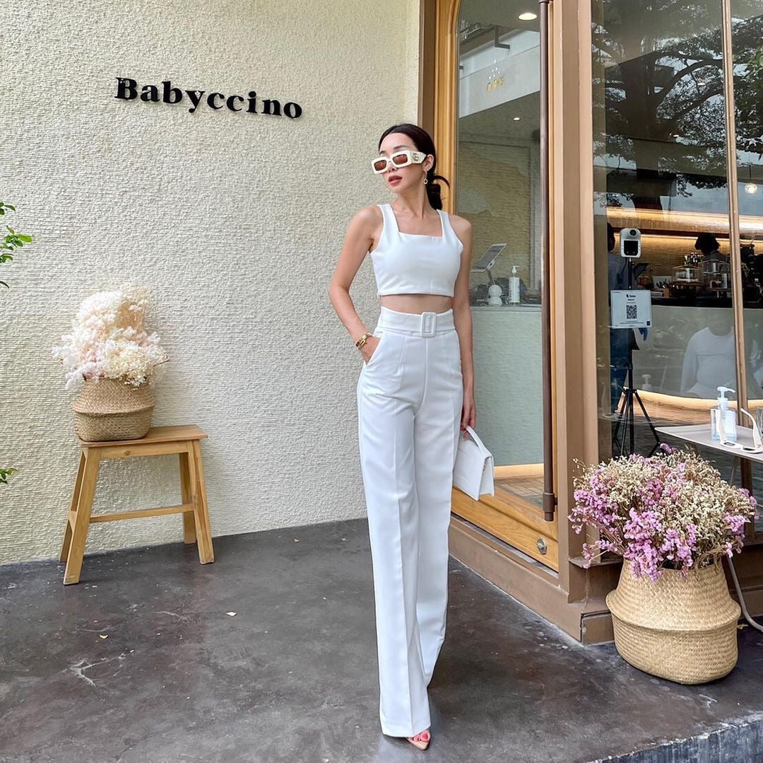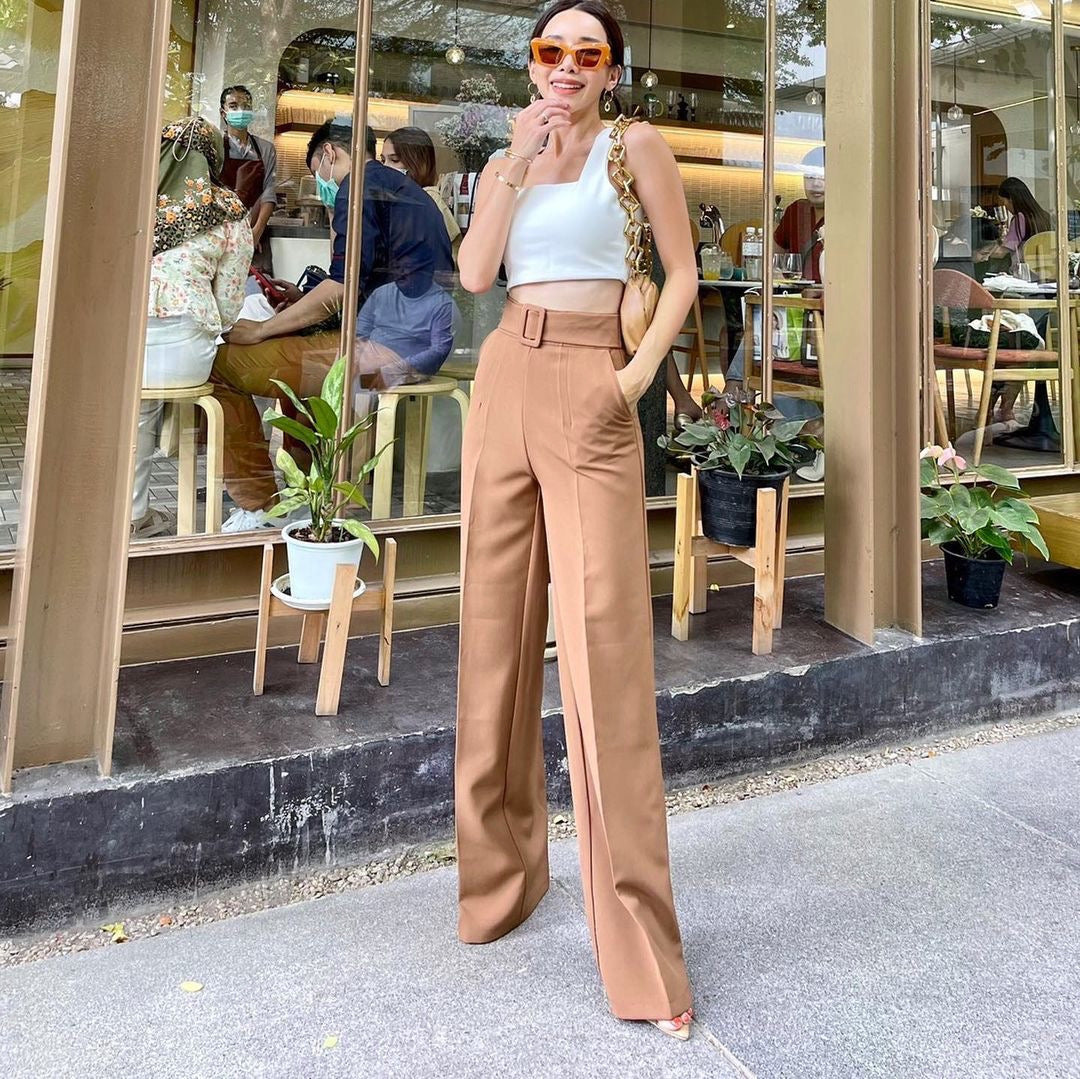 Wide Leg Belt Attached High Waist Pants