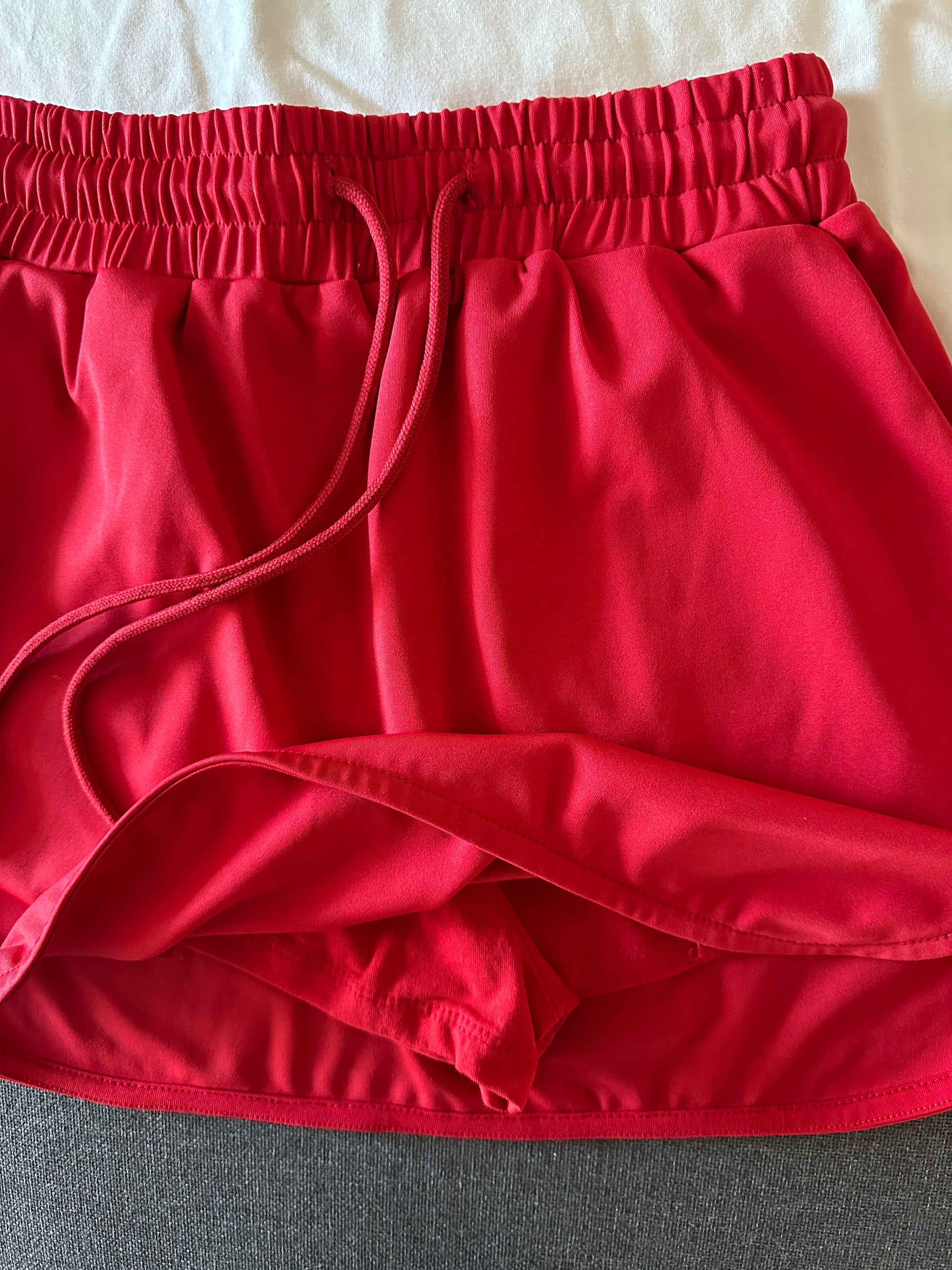 - Skirt Details: Elastic Belt, Drawstring, Short Length (15”), Divided, Pockets